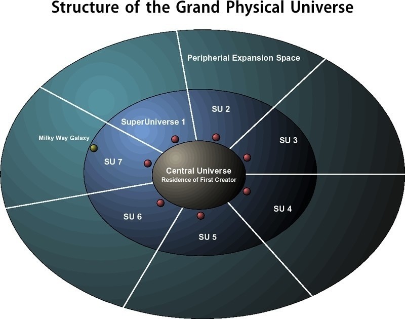 ソースが物質的に位置している場所は、「中央宇宙」と呼ばれています。それは「物質的大宇宙」の中心にあります。そのソースの故郷からは、7つに区分された「超宇宙」が伸びています。そうして「創造」の場である宇宙は形成されたのです。
